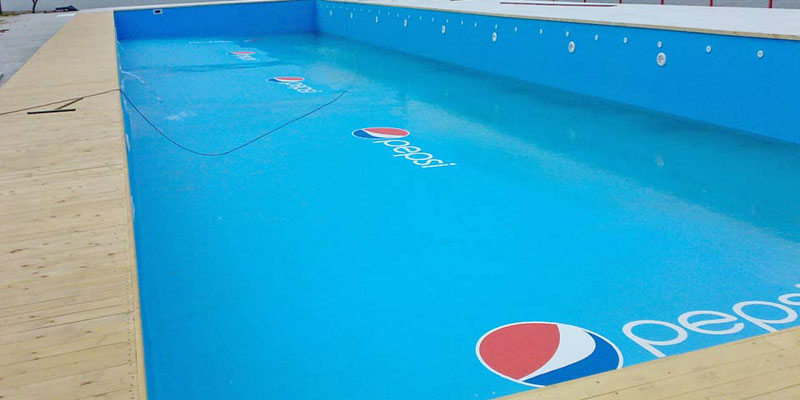 Как правило большинство бассейнов имеет мало свободных поверхностей и основным способом размещения рекламы остаются банеры и щиты на трибунах. Но, если взглянуть на пространство бассейна с точки зрения использований материалов AsphaltArt®, то возможностей использования пространства очень много. Стены, бортики, проходы вокруг чаши бассейна, чаша бассейна, конструкции вышки и тумб для прыжков и т.д. – это те места, где можно нанести наш материал с любым изображением или рекламой.
