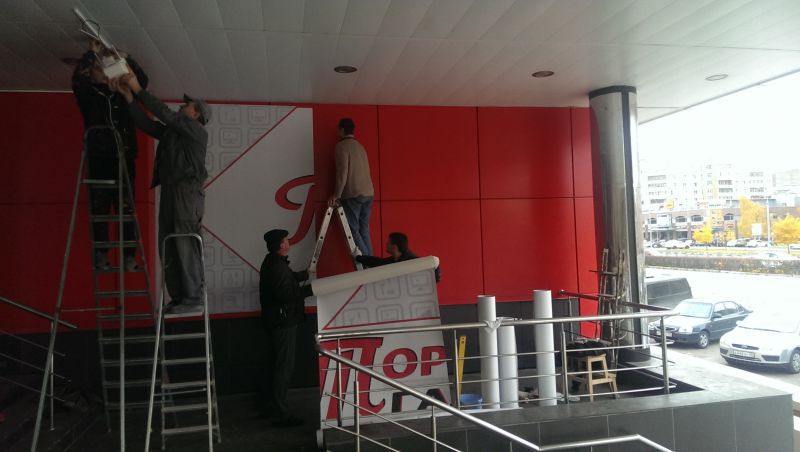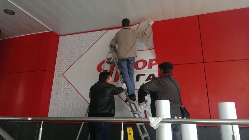 Как правило, большие вывески изготавливаются из баннерной ткани и монтируются при помощи конструкций или механического крепления к стене. Но время не стоит на месте, вывеска, показанная на фотографиях, сделана из уникального материала Asphalt Art®TexWalk®.